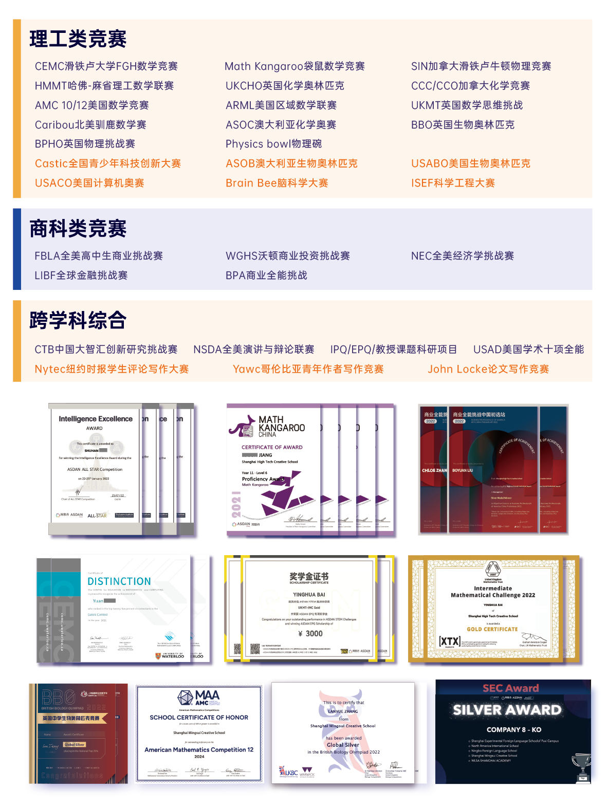 China Thinks Big、物理碗、滑铁卢数学竞赛、AMC数学竞赛、USAD十项全能比赛、VEX机器人大赛、NEC经济学比赛、Brain Bee国际脑神经科学大赛、Spelling Bee 配音大赛、HOSA全球卫生与健康大赛、沃顿KWHS全球投资大赛、全美高中生商业挑战赛、NSDA全美演讲与辩论联赛….